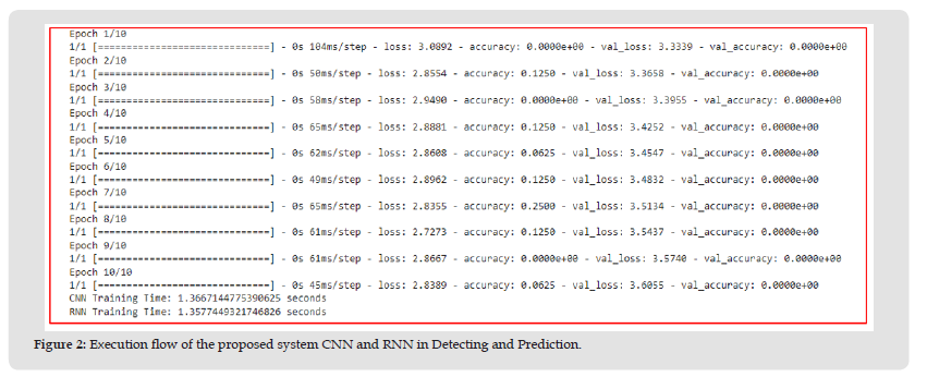 The application of CNN and RNN techniques to the viral disease’s dataset provided clear and distinctive insights. The CNN model, trained over 10 epochs, began with a training accuracy of 6.25% and consistently maintained a validation accuracy of 0%. The training loss decreased from 5.0518 to 3.0981, while the validation loss reduced slightly from 4.3639 to 4.2607 by the 10th epoch. These results suggest that although the CNN model was improving during training by reducing errors, it struggled to generalize to new data. This could be due to issues such as data imbalance, insufficient training data, or the need for more advanced feature extraction methods. Similarly, the RNN model, also trained for 10 epochs, started with a training accuracy of 12.5%, but its validation accuracy remained at 0% throughout. The training loss decreased from 3.0722 to 3.0248, while the validation loss increased from 3.0091 to 3.3042 by the end of training. These findings indicate that while the RNN model could identify some patterns within the training data, it also struggled with generalization, emphasizing the need for better model tuning or more advanced preprocessing techniques. Both CNN and RNN models showed efficient training times, with the CNN model taking approximately 1.37 seconds and the RNN model about 1.36 seconds for 10 epochs. This efficiency suggests that the models are relatively lightweight and can be quickly trained on the dataset.