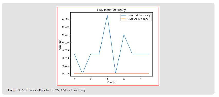 To enhance model performance, future experiments could involve increasing the number of epochs, exploring different architectures such as deeper networks or hybrid models, and augmenting the dataset with additional samples or synthetic data to provide a broader range of training examples. Additionally, advanced techniques such as transfer learning, more sophisticated tokenization of symptoms, and better management of class imbalances could be employed to improve the models' predictive capabilities [1-30]. Figure 2 depicts the execution flow of the proposed system that employs CNN and RNN models to detect and predict viral diseases. The process starts with a synthetic dataset that includes comprehensive details on 20 viral infections, such as disease names, virus types, symptoms, transmission modes, affected regions, and treatment options. This structured dataset undergoes preprocessing steps, including tokenizing symptom descriptions and label-encoding categorical variables, to make it compatible with neural network models. The CNN component is utilized to extract spatial features from the data, while the RNN component processes sequential information, with their combined outputs providing a thorough diagnostic analysis. Figure 3 depicts the correlation between model accuracy and the number of epochs during the training process of the CNN model for detecting viral diseases.