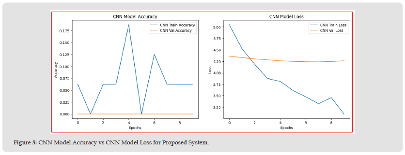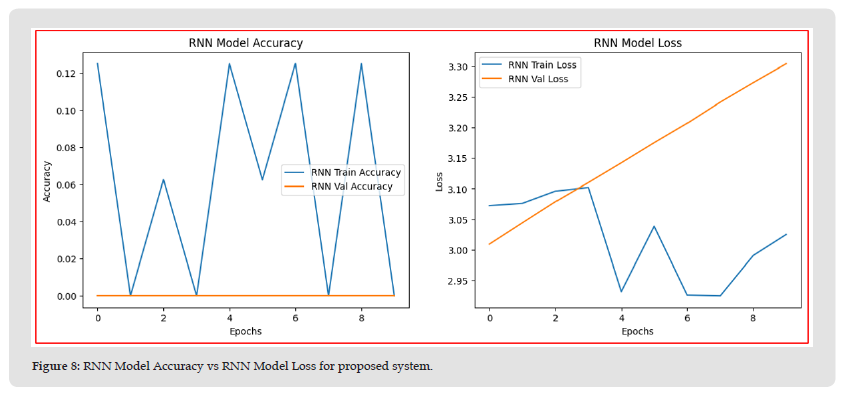 The application of CNN and RNN techniques to the viral disease’s dataset produced distinct and insightful outcomes. After 10 epochs, the CNN model started with a training accuracy of 6.25% and maintained a validation accuracy of 0% throughout the training period. The training loss decreased from 5.0518 to 3.0981, while the validation loss slightly reduced from 4.3639 to 4.2607 by the 10th epoch. This suggests that while the model was learning and reducing errors, it struggled to generalize, potentially due to factors such as data imbalance, insufficient training data, or the need for more sophisticated feature extraction methods. Similarly, the RNN model began with a training accuracy of 12.5%, but its validation accuracy also remained at 0% throughout the epochs. The training loss for the RNN decreased from 3.0722 to 3.0248, while the validation loss increased from 3.0091 to 3.3042 by the end of the training. These results indicate that while the RNN could capture some patterns in the training data, it faced difficulties in generalization, highlighting the need for better model tuning or more advanced preprocessing techniques.