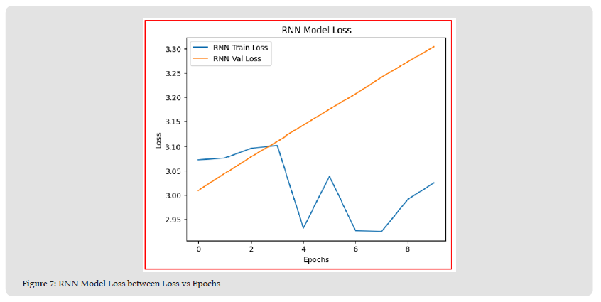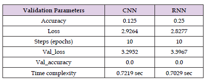 In terms of time complexity, both CNN and RNN models exhibited efficient training times, with the CNN model taking approximately 1.37 seconds and the RNN model about 1.36 seconds for 10 epochs. This efficiency suggests that both models are relatively lightweight and can be quickly trained on this dataset. However, the rapid training times also imply that the models might lack the complexity needed to fully capture the dataset's nuances, contributing to the observed low validation accuracies. To enhance performance, future experiments could involve increasing the number of epochs, exploring different architectures such as deeper networks or hybrid models, and augmenting the dataset with additional samples or synthetic data to provide a broader range of training examples. Additionally, advanced techniques such as transfer learning, more sophisticated tokenization of symptoms, and better management of class imbalances could be implemented to improve the models' predictive capabilities [1-30].