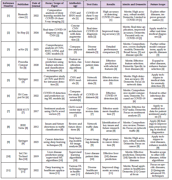 Likewise, references [3] and [4] address the broad, non-disease-specific scope of their studies, recommending more precise model comparisons and applications to specific diseases to enhance diagnostic accuracy and effectiveness. The other references further investigate various aspects and challenges of deep learning models across different contexts. Reference [6] evaluates CNN and RNN models for intrusion detection, achieving high detection accuracy but stressing the necessity of adapting these techniques to medical data for broader applicability. Reference [6] suggests extending the use of multiple machine learning models from COVID-19 detection to other infectious diseases. Reference [9] demonstrates the effectiveness of GloVe word vector representation for sentiment analysis and proposes its application to medical text data for analyzing patient sentiments. Reference [8] reviews traffic classification issues and recommends improvements in data preprocessing for medical diagnostics. References [20] and [21] focus on cancer detection and liver disease prediction, respectively, advocating for wider disease applications and refined algorithms. Finally, reference [21] explores various deep learning techniques in healthcare, urging a more focused application on specific diseases and the integration of advanced techniques to enhance overall diagnostic performance [1-21].