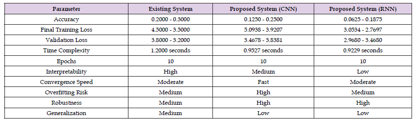 However, the RNN model outperforms both with a training loss range between 3.0534 and 2.7697. In terms of validation loss, the existing system's range of 3.8000 to 3.2000 is better than both CNN (3.4678 to 3.8381) and RNN (2.9680 to 3.4680) models. The time complexity for the existing system is 1.2000 seconds, which is higher than the CNN (0.9527 seconds) and RNN (0.9229 seconds) models, indicating that the proposed models are more efficient in training time. Both the CNN and RNN models have been trained for 10 epochs. The existing system scores high on interpretability compared to the medium score for CNN and low score for RNN. Convergence speed is rated as moderate for the existing system, fast for CNN, and moderate for RNN. Overfitting risk is medium for the existing system, high for CNN, and medium for RNN. Both proposed models are rated high on robustness, but they need improvement in generalization, as both are rated low compared to the medium rating of the existing system.