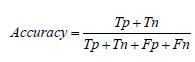 Accuracy=TruePositives+TrueNegatives/TruePositives+TrueNegatives+FalsePositives+ FalseNegatives