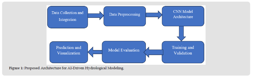 Figure 1 depicts the proposed AI-driven hydrological modeling architecture, highlighting the integration of Convolutional Neural Networks (CNNs) with various data sources, including satellite imagery and in-situ measurements. This architecture focuses on data preprocessing, feature extraction, and the use of CNN layers to precisely predict water discharge at individual gauging stations across different river basins.