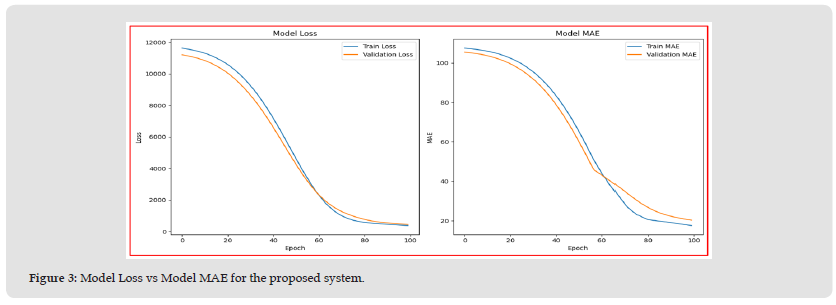 Figure 2 illustrates the comprehensive execution flow of the proposed AI-driven hydrological modeling system. This system integrates Convolutional Neural Networks (CNNs) with multiple data sources, including satellite imagery and in-situ measurements. The workflow starts with data collection and preprocessing, moves through feature extraction, and concludes with the application of CNN layers to accurately predict water discharge at single gauging stations within various river basins. Figure 3 illustrates the comparison between the model's loss and Mean Absolute Error (MAE) throughout the training epochs, showcasing the effectiveness of the proposed AI-driven hydrological modeling system.