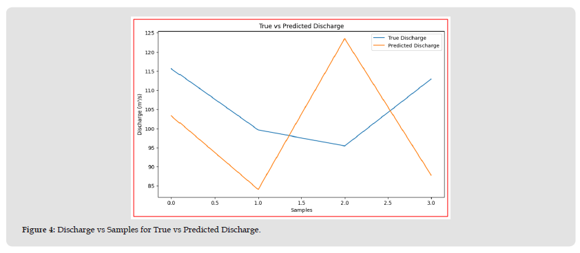 The graph reveals a notable decrease in both loss and MAE, indicating the model's enhanced accuracy and reliability in forecasting water discharge across various river basins. Figure 4 illustrates a comparison of actual and predicted water discharge values across multiple samples, showcasing the efficacy of the proposed AI-driven hydrological modeling system. The graph reveals a strong correlation between the true and predicted discharge values, underscoring the model's precision and dependability in estimating water discharge for various river basins using the provided experimental data.