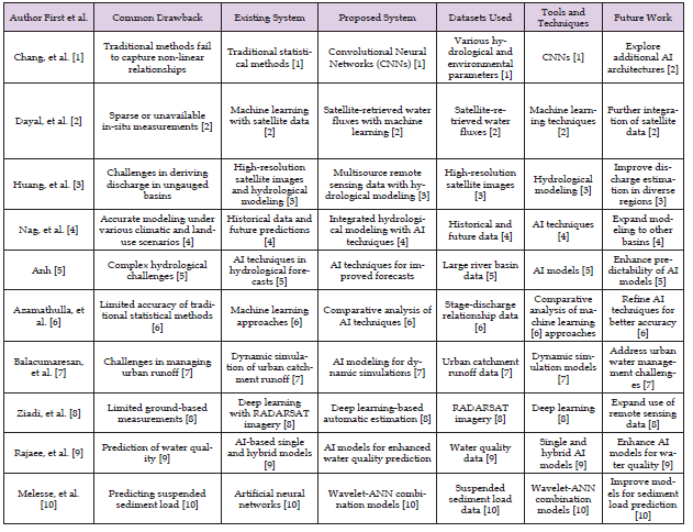 Melesse, et al. [10,11] explored using artificial neural networks (ANNs) and wavelet-ANN combination models for predicting suspended sediment load in river systems. Their studies demonstrated the effectiveness of these advanced AI techniques in capturing the complex interactions within hydrological data, leading to improved prediction accuracy. Kisi, et al. [12] compared the Mann-Kendall and innovative trend methods for water quality parameters in the Kizilirmak River, Turkey. Their research provided valuable insights into applying AI techniques in water quality monitoring, highlighting the advantages of AI over traditional statistical methods. These studies underscore the transformative potential of AI and machine learning techniques in hydrology and water resources management. Table 1 provides a comparative analysis of various methods utilized for lung cancer detection and prediction, emphasizing the advantages and limitations of each approach. Chang, et al. [1] identified that traditional statistical methods fail to capture the non-linear relationships present in hydrological data. To overcome this, they proposed using Convolutional Neural Networks (CNNs) to effectively model these complex patterns using various hydrological and environmental parameters. Their research suggests that exploring additional AI architectures could further enhance prediction accuracy. Similarly, Dayal, et al. [2] addressed the issue of sparse or unavailable in-situ measurements, particularly in monsoon-dominated catchments.
