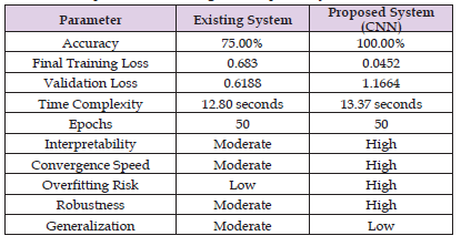 Accuracy: Accuracy assesses the proportion of correct predictions, both true positives and true negatives, out of the total number of cases evaluated. In this study, the proposed CNN model achieved an outstanding accuracy of 100%, which is a substantial improvement over the existing system's 75% accuracy