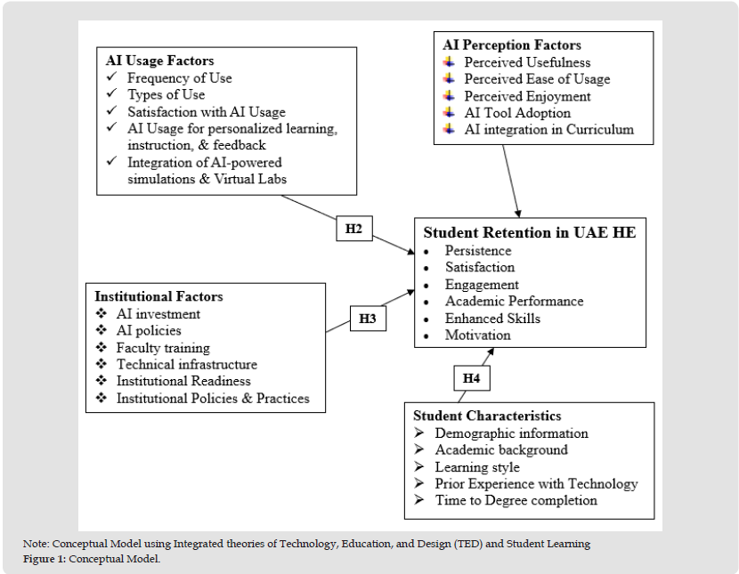 • H4: Student characteristics like demographics, academic background, learning style, and prior experience with technology significantly influence how students engage with AI tools and their overall retention in the program. Students with strong academic backgrounds or prior experience with technology may adapt more quickly to AI-driven learning environments, leading to higher satisfaction and retention. Conversely, students with limited technology experience may struggle initially but can be retained through proper support. Additionally, students who benefit from personalized learning experiences that align with their learning styles are more likely to stay engaged. The time taken to complete a degree can also affect retention, with flexible learning pathways helping to accommodate students with varying schedules. In UAE HE, the diverse student population means that institutions must cater to various learning styles, academic backgrounds, and technology experiences. Institutions that provide personalized learning support, flexible degree pathways, and digital literacy programs can better meet the needs of their students, leading to higher retention. By understanding and addressing individual student characteristics, universities can improve student satisfaction and engagement, which is crucial for retention (Matz, et al. [59]). Each hypothesis is supported by the understanding that the interplay between AI technologies, institutional commitment, and individual student characteristics collectively determines the success of AI-driven education in influencing student retention in UAE HE. Real-world examples from the UAE and global higher education support the hypothesis that AI significantly influences student retention through various factors. At the American University of Sharjah (AUS), AI-powered learning management systems, personalized feedback tools, and chatbots enhance student perceptions of usefulness and ease of use, boosting retention. UAE University’s use of AI for personalized learning and AI-powered virtual labs improves student engagement and satisfaction, demonstrating the impact of AI usage on retention. The Higher Colleges of Technology (HCT) exemplifies how institutional factors such as AI investment, faculty training, and robust infrastructure lead to improved retention outcomes. Zayed University employs AI-driven adaptive learning platforms that cater to diverse student characteristics, including learning styles and prior technology experience, ensuring that students’ progress at their own pace and remain engaged. Globally, institutions like Georgia State University use AI chatbots to improve student satisfaction, and platforms like Coursera and Udacity leverage AI for personalized learning, demonstrating AI’s role in supporting student retention across various contexts (Kamalov, et al. [60]).