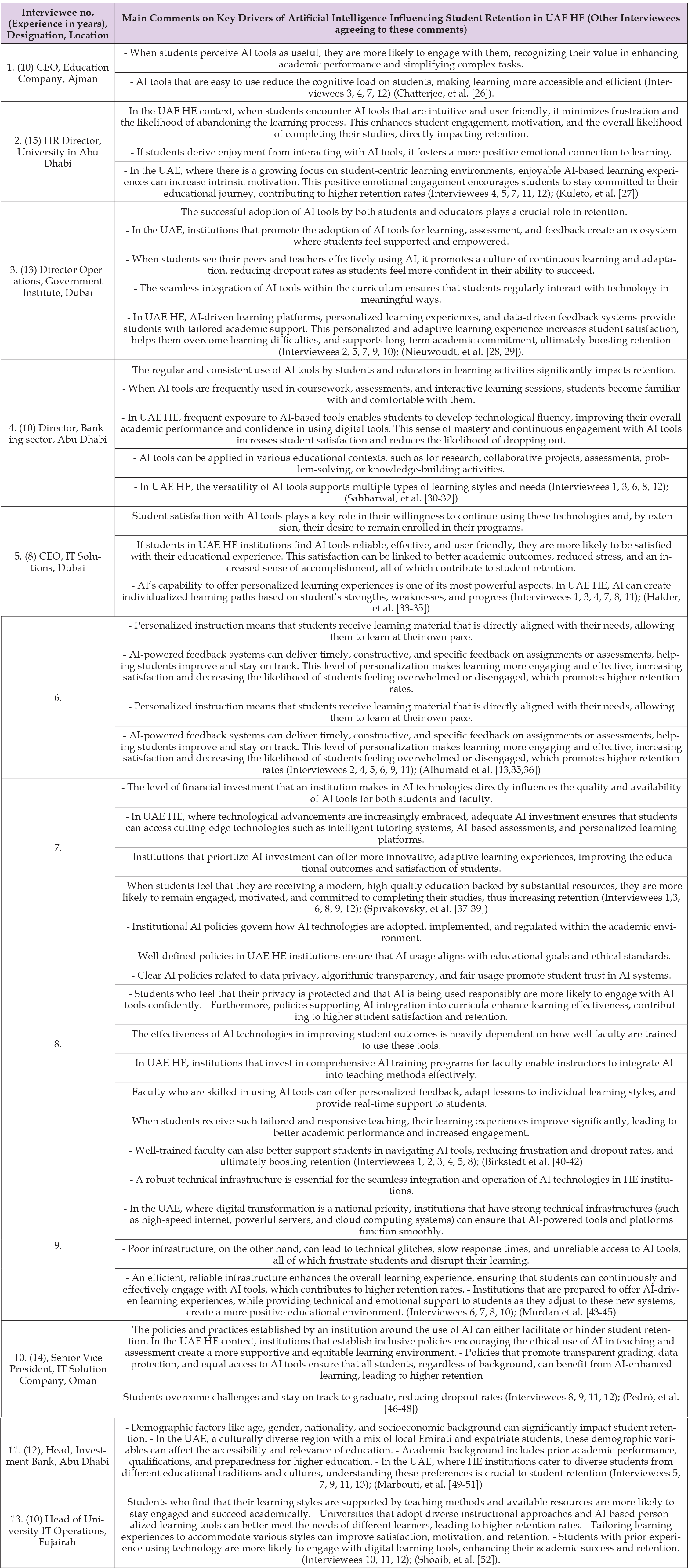 Artificial Intelligence (AI) has emerged as a transformative force across various sectors, including education, with the potential to improve student retention in higher education significantly (HE) in the UAE. AI technologies such as machine learning, natural language processing, and data analytics are being integrated into educational platforms to provide personalized, adaptive, and interactive learning experiences. This paper aims to explore the key drivers of AI that influence student retention, offering a comprehensive understanding of how these technologies can be leveraged to improve retention rates in higher education. While AI’s integration into education is not new, its rapid evolution has brought profound changes in how education is delivered and received. Traditional education often fails to meet individual learning needs, but AI technologies address this gap by enabling personalized learning experiences that cater to each student’s pace, style, and interests. These technologies, including intelligent tutoring systems, adaptive learning platforms, and virtual assistants, provide real-time feedback and support, significantly impacting student engagement and retention (Wang, et al. [1]). Student engagement is critical for retention, as engaged learners are more motivated, perform better academically, and are more likely to complete their studies.
