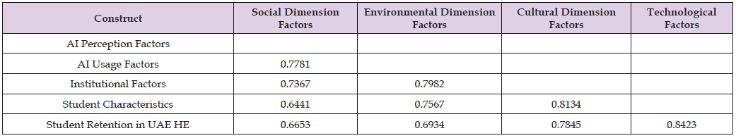 Analysis of the Measurement Model: The study employed the Dijkstra-Henseler’s rho (ρA) coefficient and Average Variance Extracted (AVE) values to assess construct validity, alongside a discriminant validity analysis to ensure the uniqueness of the constructs. Results from the discriminant validity analysis demonstrated that correlations within each construct were higher than those between different constructs, confirming strong discriminant validity. Additionally, structural equation modeling (SEM) was utilized as a robust statistical technique to test hypotheses and analyze relationships among the constructs. SEM’s ability to manage complex models and evaluate multiple relationships simultaneously made it an ideal choice for this study. Its application enabled a thorough exploration of the connections between the constructs, providing critical insights into the UAE Higher Education (HE) Model. Overall, the study adopted well-established methods to assess construct validity, convergent validity, and discriminant validity, with SEM offering valuable insights into the interrelationships of the constructs (Iyer, et al. [53]). In PLS path modeling, assessing construct validity typically involves examining indicator variables and their outer loading values.