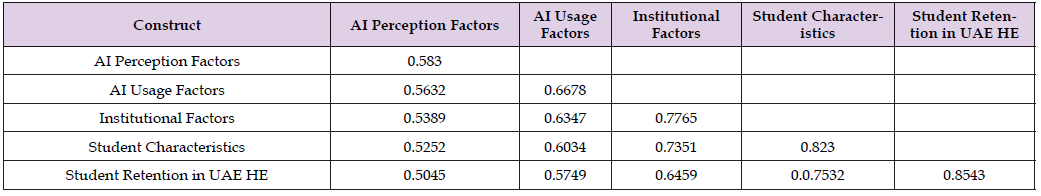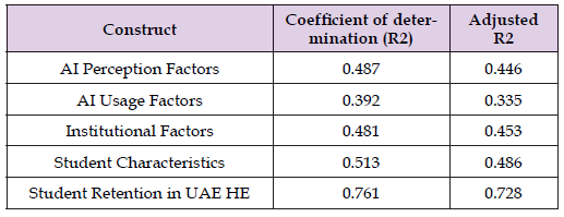 Table 5 presents the cross-loadings, highlighting the influence of variables on each other. The coefficient of determination (R²) measures the relationship between constructs in the study. A minimum R² value of 0.25 was required for a construct to be deemed relevant and significant. The R² value for Student Retention in UAE Higher Education was 0.761, indicating that the construct is not only relevant and significant but also demonstrates a strong capacity to explain the variables in the research. The research framework developed and tested for validity and reliability using PLS-SEM has made a valuable contribution to this study, supported by the consensus of 378 respondents, representing stakeholders in the UAE higher education sector. The methodology addresses the scarcity of relevant data, providing a foundation for future researchers to refine or develop similar models. While the theories cited are relevant in stable economies with equal educational opportunities and available infrastructure, they fall short in explaining factors during periods of recession, war crises, or sanction regimes. Therefore, this research offers a robust, evidence-based framework to guide future work in such contexts (Iyer, et al. [53]). The third-level relationships are not considered relevant for this study, as their β values fall below the 0.01 threshold. Figure 2 shows the PLSSEM Validation framework given by the ADANCO software. (Sarstedt, et al. [54]) (Tables 3-8) (Figure 2).