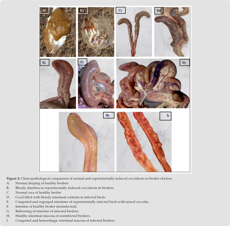 The severity of congestion, hemorrhage, and ballooning of ceca in guava-supplemented groups (G-I, G-II, G-III, G-IV) was less severe compared with synthetic anticoccidial (G-V) and positive control (GVI) groups (Table 3). Commonly all infected supplemented and treated groups showed a gradual increase of congestion of all intestinal mucosa and the ceca were ballooned from 5th to 9th dpi. On the other hand, G-VI (infected and non-treated) showed severe congestion, an increase in the thickness of the intestinal wall, severe hemorrhage, ballooning of the intestine and the presence of bloody cecal core from 5th to 7th dpi. The severity of congestion gradually decreased within 10 and 11th dip. Furthermore, G-VII (non-infected and non-treated) showed no lesions. The clinicopathological comparisons of normal and experimentally induced coccidiosis in broiler chicken are illustrated in figure 2.