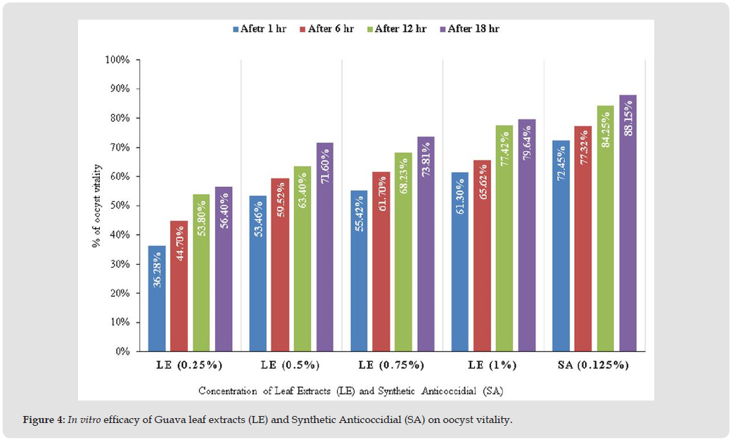Coccidiosis is a globally occurring economic health hazard of chicken that can infect any type of poultry in any type of facility [30]. The severity of Eimeria infection in chickens is usually assessed by loss of body weight gain, excretion of fecal oocysts, and the presence of intestinal lesions [4]. The present study was planned to evaluate an in- vitro efficacy of different concentrations of guava leaf extracts on mixed Eimeria oocysts vitality and application of the most effective concentrations in vivo on the experimentally infected broiler chicks with local isolates of mixed Eimeria species. The present work showed the detrimental effects of coccidiosis on clinical signs, mortality rate, lesion scoring, and oocysts count after challenging the chicks with oocysts of mixed Eimeria sp. These findings demonstrated the successful experimental induction of coccidiosis in broilers with field isolates that confirmed the pathogenicity of Bangladeshi field isolates. The in vitro study revealed that the aqueous extracts of guava leave induced anticoccidial effect which was concentration dependent and increased by increasing the concentration of the tested extracts. Guava leaves by its high concentration exerted the greatest percentage reduction in oocysts count and vitality and had high in vitro anticoccidial effect (Table 4, Figure 2).