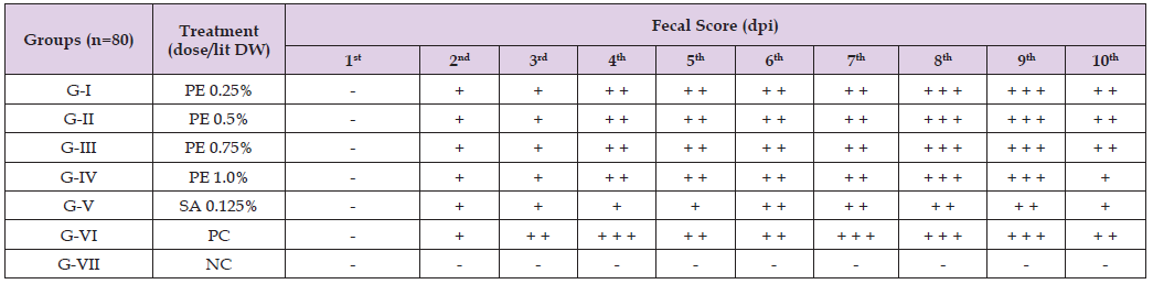 Table 2: Fecal score of broiler chickens experimentally infected with mixed species of Eimeria and treated with leaf extract of P. guajava and synthetic anticoccidial Amprolium.