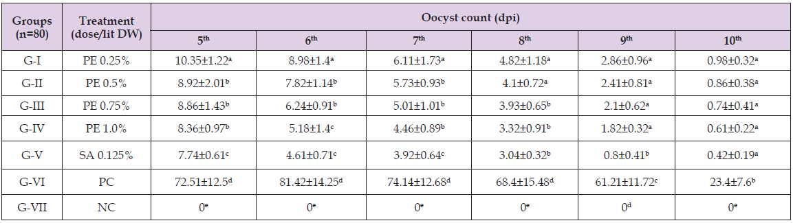Effects of Plant Extracts on Oocysts Count: Freshly voided droppings were collected from each group for oocysts count daily from the 5th till the 10th day of post-infection (dpi). The samples were either processed or refrigerated for a maximum of 1 day until processing. Mean oocyst count per gram of feces for each group was recorded using a modified Mac Master Technique, following standard procedure [29]. Briefly, 2 grams of feces were mixed with 30 ml of a saturated salt solution and homogenized thoroughly. A portion of the solution was extracted immediately after mixing with a pipette and placed in one half of a Mac Master slide. Same procedure was repeated for the other half of the slide. The total oocysts count from both sides of the chamber was multiplied by 50 to estimate the number of eggs in the sample, with results reported as oocysts per gram (OPG).