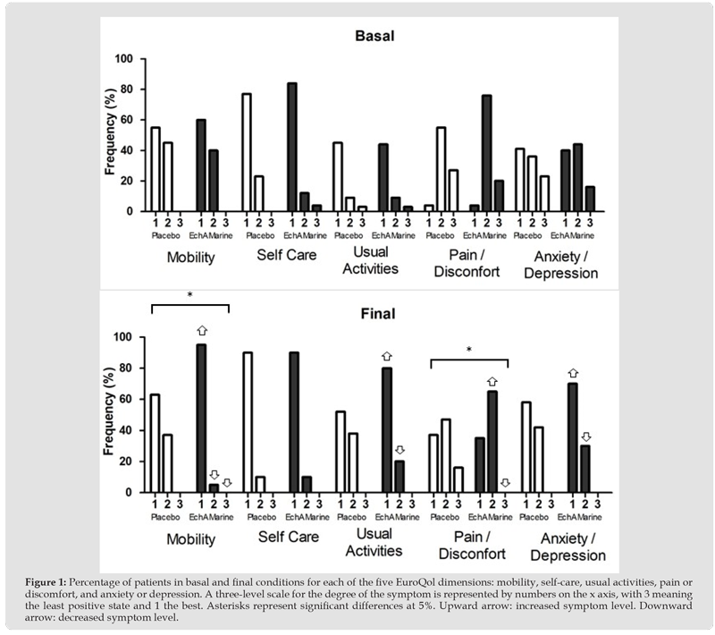 EuroQol surveys were undertaken face-to-face at the start of the study and, again, after three months. Day 1 is the day of the first intake of EchA Marine®. The objective and design of the study were carefully explained, and a brochure with information regarding the clinical trial and the nutraceuticals was provided to the patient. It was mandatory that the patient formally confirm their acceptance of the express informed consent by signing the informed consent.