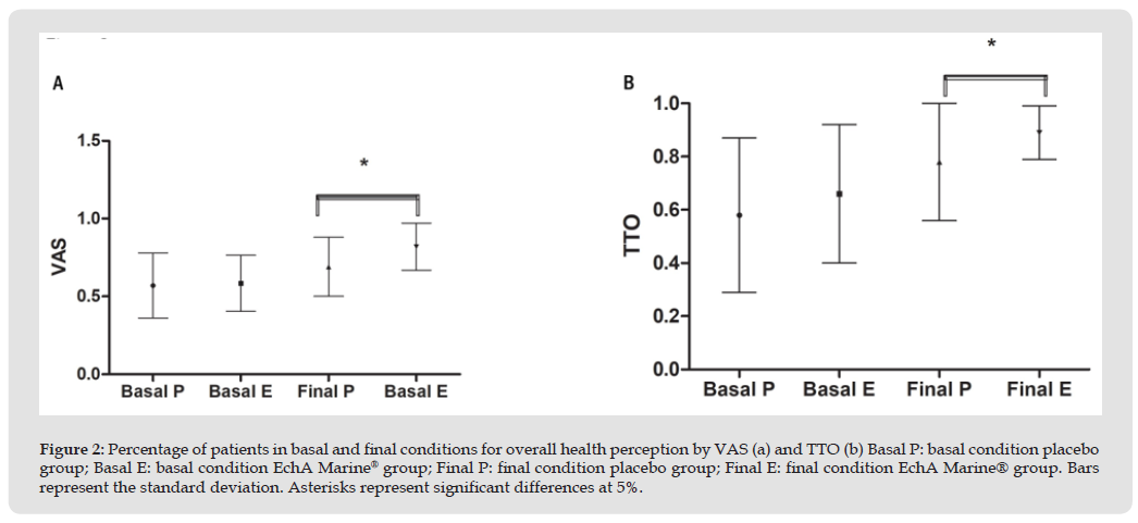 The multivariate result was not significant for treatment at the start (Basal) of the trial (Pillai’s Trace = 0.22, F = 1.552, df = (7), p = 0.180), indicating no statistical differences in the response of the EuroQol 5-D 3L Questionnaire between placebo and Echa Marine groups (Table 2). All patients reported a decrease in quality of life in some of the five dimensions, with values of 2 and 3 being the most frequent (Figure 1). Three months of treatment with the dietary supplement resulted in a significant decrease in the values of two of the five EuroQol dimensions (Figure 1, Table 2). The multivariate results were significant for treatment at the end (Final) of the trial (Pillai’s Trace = 0.323, F = 2.205, df = (8), p = 0.048). The univariate F tests showed there was a significant difference between placebo and Echa Marine values for mobility (F = 6.738, df = (1), p = 0.013), pain and discomfort (F = 8.863, df = (1), p = 0.005), VAS (F = 5.632, df = (1), p =0.022) and TTO values (F = 9.746, df = (1), p =0.003). The most significant effect was observed in the reduction of pain and discomfort, where the placebo had no effect. In fact, patients who consumed the dietary supplement did not have values of 3 in any dimension at the end of the treatment, whereas patients in the placebo group still had values of 3, indicating a positive resolution of symptoms when consuming EchA Marine®. TTO and VAS also improved after treatment (Figure 2), indicating an improvement in overall quality of life after treatment.