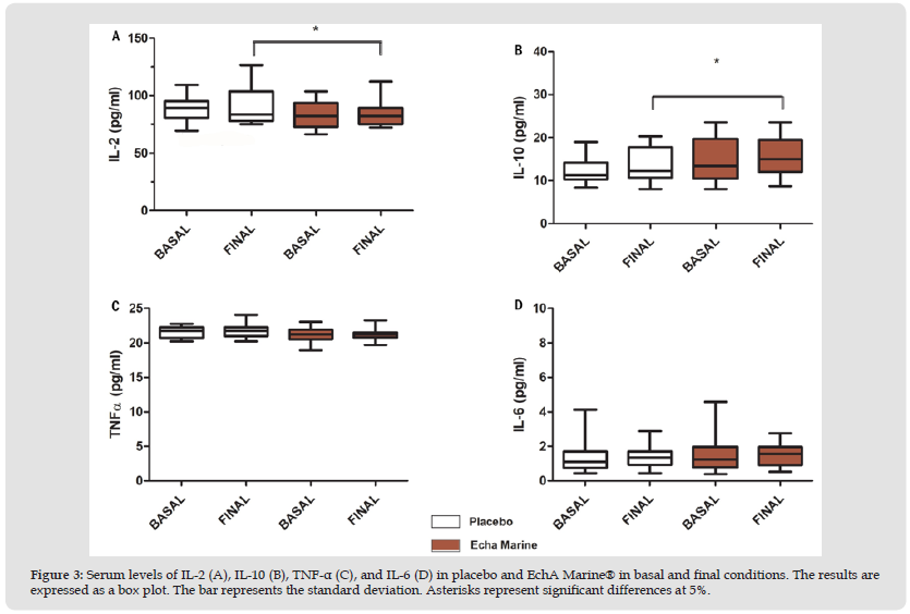 There were no significant differences between groups in terms of any cytokine values at the start (Basal) of the trial (Table 3). Three months of treatment with the dietary supplement, however, resulted in a significant decrease in IL-2 mean values (Placebo mean: 90.03 pg/ml ± 14.99; Echa Marine® mean: 84 pg/ml ± 11.20) and a significant increase in IL-10 mean values (Placebo mean: 12.43 pg/ml ± 3.14; Echa Marine® mean: 15.48 pg/ml ± 4.60). The values of IL-6 and TNF-α, on the other hand, did not differ significantly (Figure 3, Table 3).