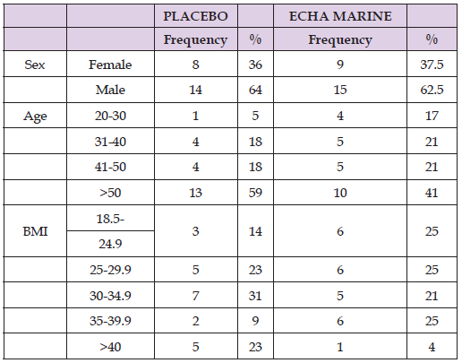 A total of 50 long COVID patients were recruited for this multicenter, double-blind, randomized study from September 2021 to December 2022. Twenty-two patients received a placebo, twenty-four received treatment with EchA Marine®, and four patients did not complete the protocol. Both the placebo and treatment groups had similar distributions of age, sex, and BMI (Table 1).