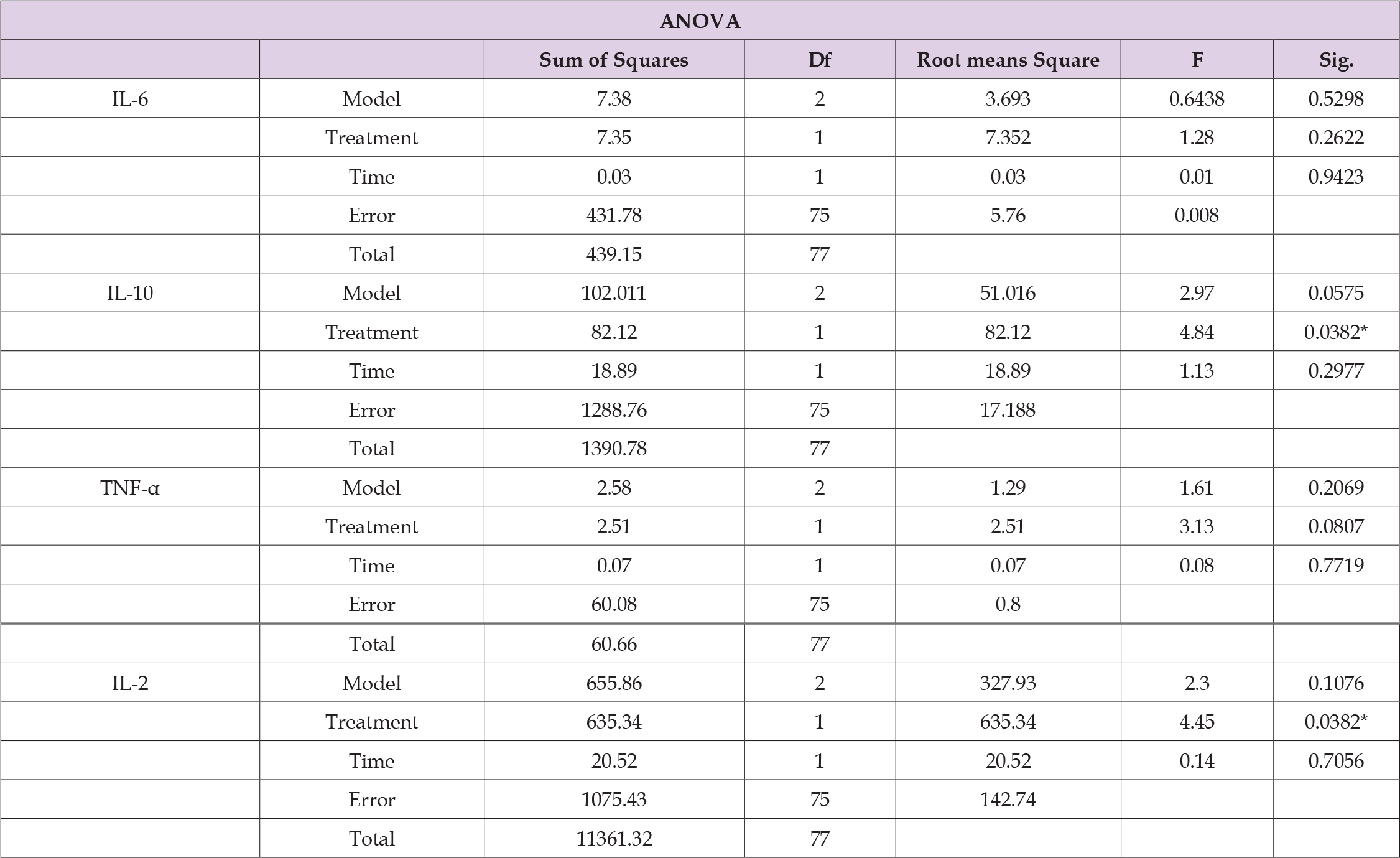 Note: IL-6: interleukin type 6. IL-10: interleukin type 10. TNF-𝛂𝛂: tumoral necrosis factor alpha type. IL-2: interleukin type 2. * Significative differences at 5%.