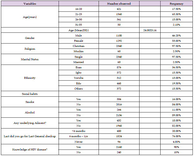 Socio-demographic characteristics of the study population is revealed in Table 1. The subjects were categorized into four age groups of 16-20 years, 21-25 years, 26-30 years and 31-35 years. The age distribution showed that majority of the subjects were within the age range of 21-25 years (65.3%), followed by 16-20 years (17.5%) and 26-30 years (15.0%) with 31-35 years been the least (2.1%). The Age (Mean ± SD) of the subjects was (24.00 ± 3.14). With respect to gender, majority (53.8%) of the subjects were females while the remainder (46.2%) were males. According to the religion, most of the subjects were Christians (97.5%) and 2.5% were Muslims. According to the marital status of the subjects, the result showed that most of the subjects were single (97.5%) while married subjects constituted 2.5%. In relation to ethnicity, majority (36.5%) of the subjects are Esan, followed by Edo (19.5%), with Igbo and others being 15.5% and Yoruba accounted for 13.0%. According to social habits, 84.0% of the subjects do not smoke and 89.0% do not take alcohol while 16.0% of the subjects smoke and 11.0% take alcohol. According to underlying sickness, 82.0% of the subjects do not have any underlying sickness while subjects with illness accounted for 18.0%. With respect to last general check-up, most of the subjects (76.0%) went for general check-up in the last 6 months to 1 year, followed by <6 months (20.0%) and 4.0% never went for general check-up. According to knowledge of HIV disease, 90% had HIV knowledge while 10% did not have.