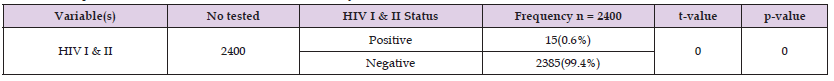 Conclusion: In conclusion, HIV I & II prevalence in the study area was low. Nonetheless, we recommend the establishment of ART services in the study area in other to minimize the burden of the disease.