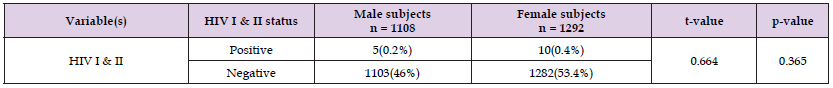 The seroprevalence of HIV I & II antibodies with respect to gender is presented in Table 3. HIV I & II seropositivity rates of 0.2% and 0.4% were obtained for the male and female subjects respectively. Statistical comparison revealed that there was no significant difference (p>0.05) between HIV I & II seroprevalence and gender.