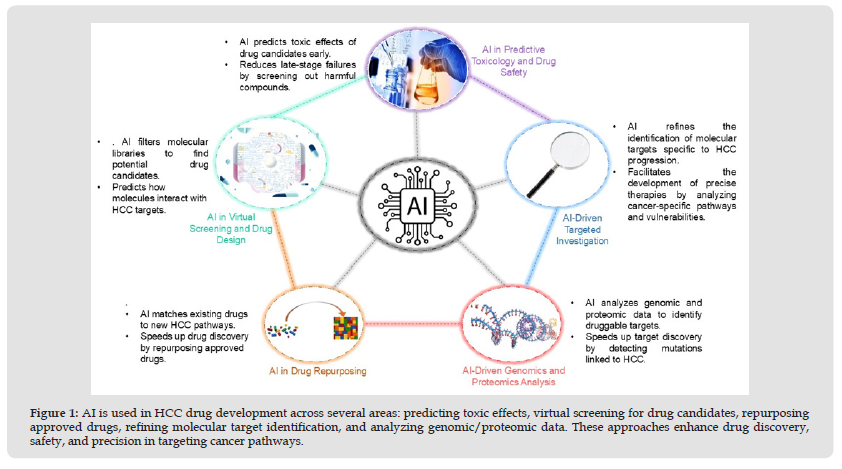 This process accelerates the identification of promising drug candidates and optimizes their chemical structures for better performance [18]. By analyzing patient data, AI help in treatments to individual patients based on their genetic profiles and other factors, aiming to increase the effectiveness of therapies while minimizing their side effects [16]. This review explores that AI significantly enhance the drug discovery process and clinical management of HCC by integrating multi-omics data and advanced computational techniques. AI-driven models have the potential to predict drug responses, optimize treatment strategies, and improve clinical trial designs, ultimately revealing the challenges of intratumoral heterogeneity and treatment resistance in HCC.