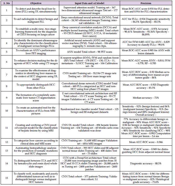 AI algorithms analyze electronic health records and clinical trial data to identify correlations between existing medications and patient outcomes. For instance, AI has revealed that certain drugs initially developed for other conditions have positive effects on HCC patients, thereby creating opportunities for repurposing these agents [35]. Advanced ML models integrate diverse data types, including drug response data and molecular profiles, to predict the efficacy of existing drugs against HCC. For example, AI models trained on large datasets identify drugs that may be effective against specific HCC subtypes, guiding personalized treatment approaches [27,33]. While AI predict potential repurposing candidates, experimental validation remains essential. AI-driven predictions streamline the selection of compounds for further testing, enabling researchers to focus on the most promising candidates for HCC treatment [22,34]. Table 1 summarizes various AI, DL and ML approaches used for detecting and characterizing focal liver lesions (FLLs) and HCC using imaging techniques such as ultrasound, CT, MRI, and histopathology slides. Each study employs different models, including CNNs, SVMs, and ANNs, to improve diagnostic accuracy. The models demonstrated high precision in distinguishing benign from malignant lesions, with mean area under the receiver operating characteristic curve (ROC-AUC) scores often exceeding 0.9, reflecting their strong diagnostic potential. For instance, the CNN model used for HCC detection from histopathology slides achieved a mean ROC-AUC score of 0.949, while a deep convolutional dense network (CDN) attained 0.925 for FLL characterization.