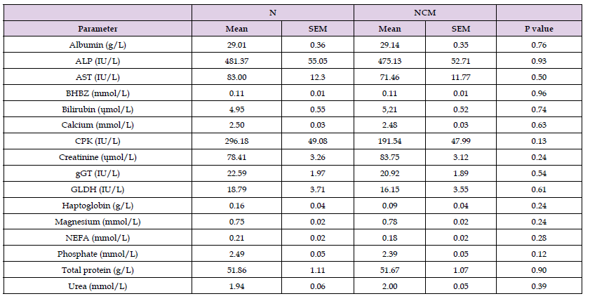Table 2: Mean value and standard error of mean of 16 blood plasma parameters in BRD affected calves randomly assigned to a single antimicrobial treatment with florfenicol 40 mg/kg subcutaneously (N) (N = 22) or a single antimicrobial treatment with florfenicol 40 mg/kg subcutaneously and an adjunctive intramuscular injection with 12 ml of a combination of butaphosphan 100 mg/ml and cyanocobalamin 50 μg/ml (Catosal®; Elanco) for 3 consecutive days (NCM) (N = 24) at the day of enrolment.
