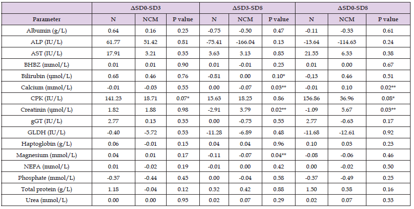 Table 4: The evolution of blood plasma parameter results between study day 0 (SD0) and SD3 ( ΔSD0-SD3), SD3 and SD8 (Δ SD3-SD8) and SD0 and SD8 Δ (SD0-SD8) for BRD affected calves that received a single antimicrobial treatment with florfenicol 40 mg/kg subcutaneously (N) (N = 22) or a single antimicrobial treatment with florfenicol 40 mg/kg subcutaneously and an adjunctive intramuscular injection with 12 ml of a combination of butaphosphan 100 mg/ml and cyanocobalamin 50 μg/ml (Catosal®; Elanco) for 3 consecutive days (NCM) (N = 24). Trends in significance (P = 0.05-0.10) are indicated by *. Significance at P < 0.05 is indicated by **.