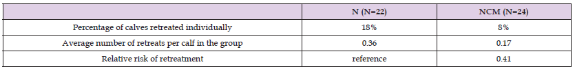 The delta in blood serum concentration in CPK between SD0 and SD3 tended to be smaller in NCM versus N (P = 0.07) (Table 4). The delta of calcium, magnesium, and creatinine concentration between SD3 and SD8 show significant differences between NCM and N (P < 0.05) (Table 4). The delta of blood serum concentration in bilirubin between SD3 and SD8 shows a trend to be smaller in the NCM versus N (P = 0.10) (Table 4). Finally, the delta of calcium and creatinine concentration between SD0 and SD8 differs significantly between N and NCM (P < 0.05), whereas the delta of CPK concentration shows a trend to be bigger in the NCM group (P = 0.08). No significant differences were found in total BRD scores between N and NCM during the study. In the N group 18 % of the calves got a treatment with antibiotics and non-steroidal inflammatory drugs in the post-study phase, whereas in the NCM group 8 % of the calves received an additional treatment. The average number of retreatments was 0.36 versus 0.17 per calf in the N and NCM group, respectively (Table 5). The relative risk of retreatment was 0.41 in NCM versus N.