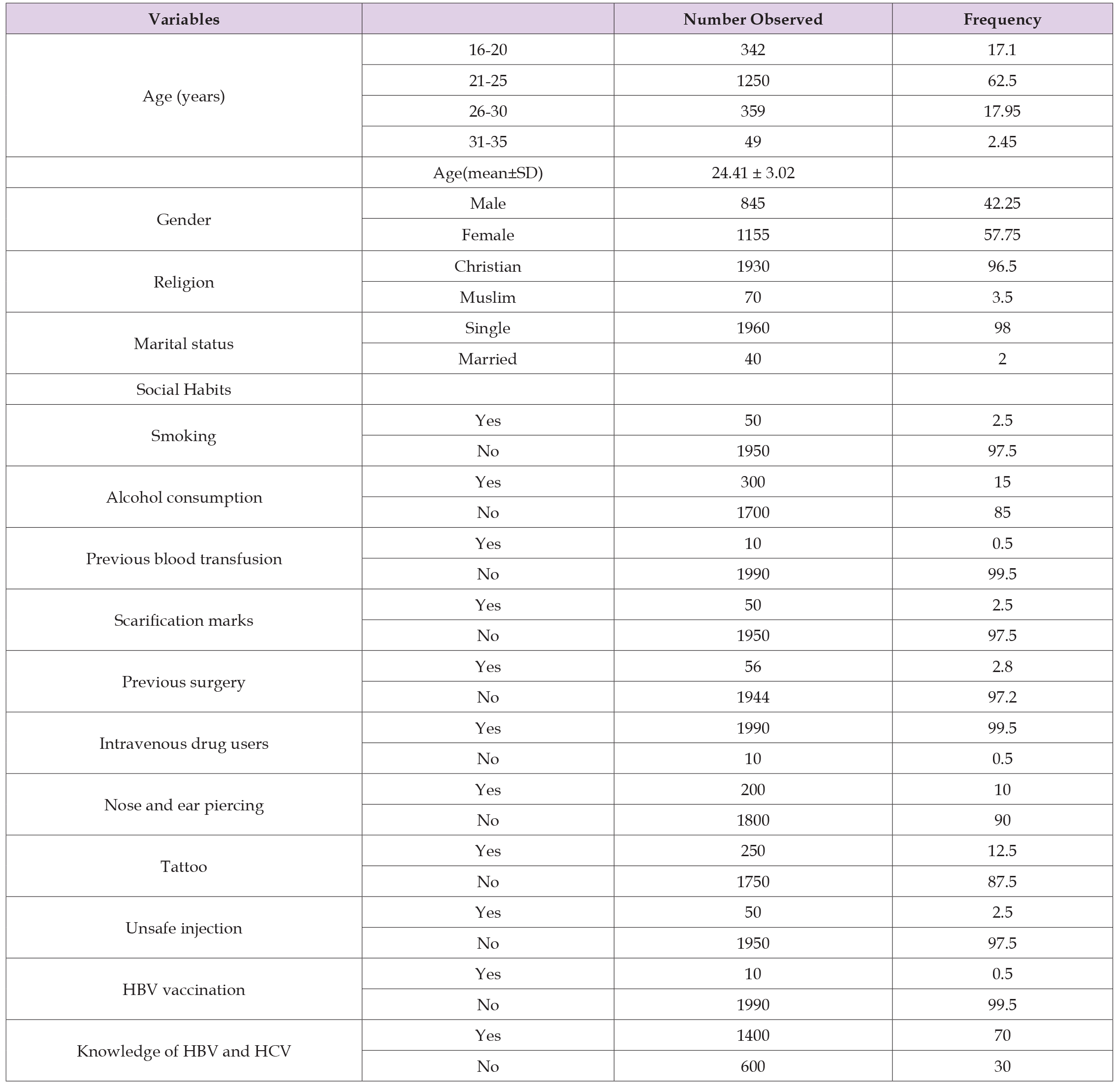 On the other hand, Dawurung et al. [32] reported the gender-related prevalence of HCV to be 4.9% in males and 2.6% in females. No apparent reason can be given for this, but the variation might be caused as prior mentioned due to differences in geopolitical location of the study population and socio-cultural practices. Subjects in the age range of 21-25 years recorded the highest HBV seroprevalence of 0.65% followed by individuals belonging to the age groups 26-30 years who had 0.45% while seroprevalence rates of 0.1% and 0% were obtained for the respective age groups of 16-20 years and 31- 35 years. Our result concurs with the earlier reports of Adabara et al. [22] who reported the highest HBV seroprevalence of 8.1% among subjects in the age group of 21-24 years compared to the other age groups they studied. Nwodo et al. [26] also reported that the highest prevalence of HBsAg infections was observed in participants aged 26- 35 years, demonstrating statistical significance. Furthermore, Agbana et al. [23] observed that about one quarter (15.2%) of those in the age group 26-30 years were positive for HBsAg compared with less than one tenth (3.1%) of the respondents. Considering the age group most affected in this study, one can infer that it correlates with the age of greatest sexual activity thus lending credence to the role of sexual transmission [41]. Tattooing, nose and multiple ear piercing are some of the common practices this age group indulge in because of reduced parental control and the increased freedom they enjoy in the university environment.