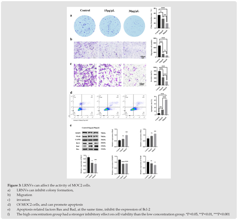 LRNVs Can Inhibit Colony Formation, Migration and Invasion of MOC2 Cells: After 24h of LRNVs, the colony formation level (Figure 3a), migration (Figure 3b) and invasion (Figure 3c) ability of MOC2 cells in 15 μg/μL and 30 μg/μL of LRNVs were significantly lower than those in the control group and the inhibitory effect of LRNVs on MOC2 cell function increased with increasing concentration. The difference was statistically significant.