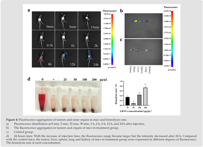 In vivo imaging of small animals showed strong fluorescence aggregation in the abdomen of C57BL/6J mice and the fluorescence expression range increased over time (Figure 4a). In addition, compared with the DiR-PBS group, the DiR-LRNVs group had different degrees of fluorescence aggregation in other organs except the heart (Figures 4b & 4c). The results of hemolysis test showed that the hemolysis rate of each concentration was less than 5%, which met the national standard (Figure 4d). It had been shown that the use of LRNVs in vivo were relatively safe.