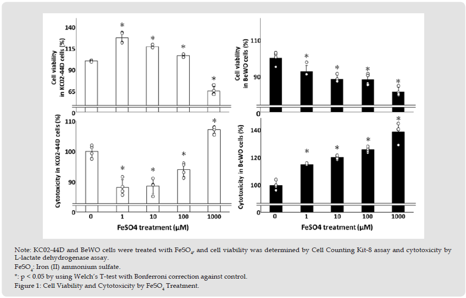 KC02-44D or BeWO cell lines in the logarithmic growth phase were seeded in each well of a 96-well plate with 5,000 cells/100 μL medium and cultured overnight in a CO₂ incubator. A group of cells was prepared with 0 μM, 1 μM, 10 μM, 100 μM, and 1,000 μM of iron (II) ammonium sulfate and cultured in a CO₂ incubator for 24 h. After 24 h, 20 μL of Lysis Buffer for LDH was added to High CTL and the cells were cultured in a CO₂ incubator for 30 min. Fifty μL of the culture supernatant was transferred to another plate, and 5 μL of CCK-8 (Dojin Chemical Laboratory, Kumamoto, Japan) was added to the remaining cells other than the High CTLs and cultured in a CO₂ incubator for 3 hours. To 50 μL of culture supernatant transferred to another plate, 50 μL of Working sol for LDH was added, and the plate was light-shielded and left at room temperature for 30 min. After 30 min, 25 μL of Stop sol was added to stop the reaction. The absorbance at 490 nm in each well was measured with a 2030 ARVO (Perkin-Elmer Japan, YOKOHAMA, JAPAN), and the amount of LDH (originally present in the cells) released into the medium under each condition was calculated using the value of the 0 μM group as 0% to measure cytotoxicity. On the other hand, the absorbance at 450 nm of each well of the plate to which CCK8 was added was measured with a microplate reader (Perkin-Elmer Japan, YOKOHAMA, JAPAN), and the cell viability was examined with the 0 μM group as 100%.