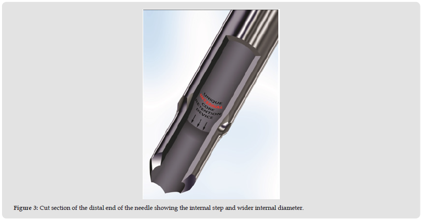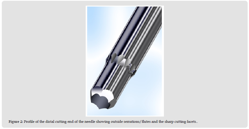 The needle (Figure 1A) which has an overall length of 100 mm, a uniform external diameter of 3.25 mm, and a constant internal diameter of 2.5 mm except for the 3.5 mm distal portion where it is narrowed and has multiple surface serrations/flutes (Figure 2). The terminus of the needle has six sharp cutting facets (Figure 2). The internal diameter of the needle’s distal portion is less than the overall internal diameter of the needle and begins with a short, slanted step of 0.2 mm (Figure 3). This specially designed distal portion (Figures 2 & 3) not only cuts the tissue cleanly and retains the biopsy specimen captured within the lumen of the needle so that it does not slip out of the needle during the process of its withdrawal. The larger internal diameter of the needle at its proximal segment provides free space (Figures 3 & 4) within the interior of the instrument thus avoiding crushing and compression of the tissue as well as plugging the lumen of the needle. It also facilitates easy delivery of the biopsy sample through the proximal end of the needle.