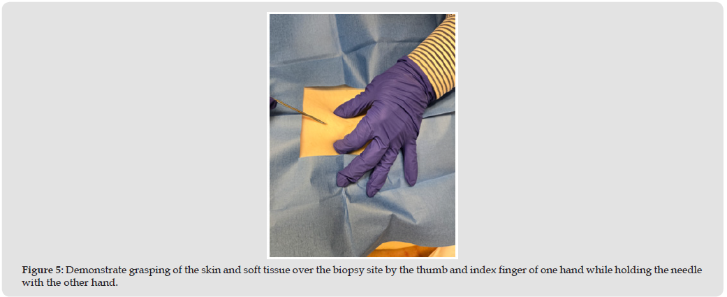 Minimally invasive surgical techniques such as needle aspiration are the most common method of taking abdominal wall fat pad biopsy. Conventionally the skin on the lower quadrant area of the abdomen lateral to the midline and below the umbilicus is chosen. A rhomboid shaped area is marked, and the skin is cleaned and numbed with local anesthetic [1]. Following this a 16 or 18G needle attached to a 10- or 20-ml syringe is passed through the skin and into the fat pad under the skin and aspiration is performed. This process is usually repeated multiple times and at different angles to obtain enough materials for cell block preparation of aspirated materials and Congo red stain. The fat pad aspiration biopsy is simple, inexpensive, non-invasive, and the preferred screening test for amyloidosis [2]. However, studies indicate that fat pad aspiration by needle does not yield enough tissue for evaluation in some cases [3]. Furthermore, the sensitivity of this test depends on several factors, including the extent of organ involvement, operator skill, amount of fat tissue obtained and submitted for microscopic evaluation [4]. The technique is cumbersome and harvesting aspirated fat tissue for the preparation of tissue block can be time-consuming and unlike punch biopsy, no stitch with suture to close the wound is required. We describe a practical, and effective method of sampling a sufficient amount of abdominal fat pad using a new core retention biopsy needle. This needle was originally designed for obtaining bone marrow trephine (core) biopsy specimens [5] but it can also be used for obtaining abdominal fat pad and other soft tissue biopsies and can be done at an outpatient clinic and requires no technical expertise.