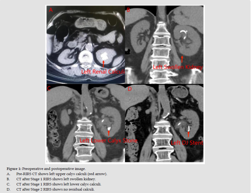 She underwent left retrograde intrarenal surgery (RIRS) with DJ stent placement for multiple renal calculi. The procedure was uneventful, and she was discharged two days postoperatively. Two weeks later, she developed fever (up to 39.5 °C) accompanied by left-sided flank pain. Physical examination revealed positive left kidney percussion pain. She was diagnosed with acute pyelonephritis, and her symptoms resolved after anti-infective therapy.