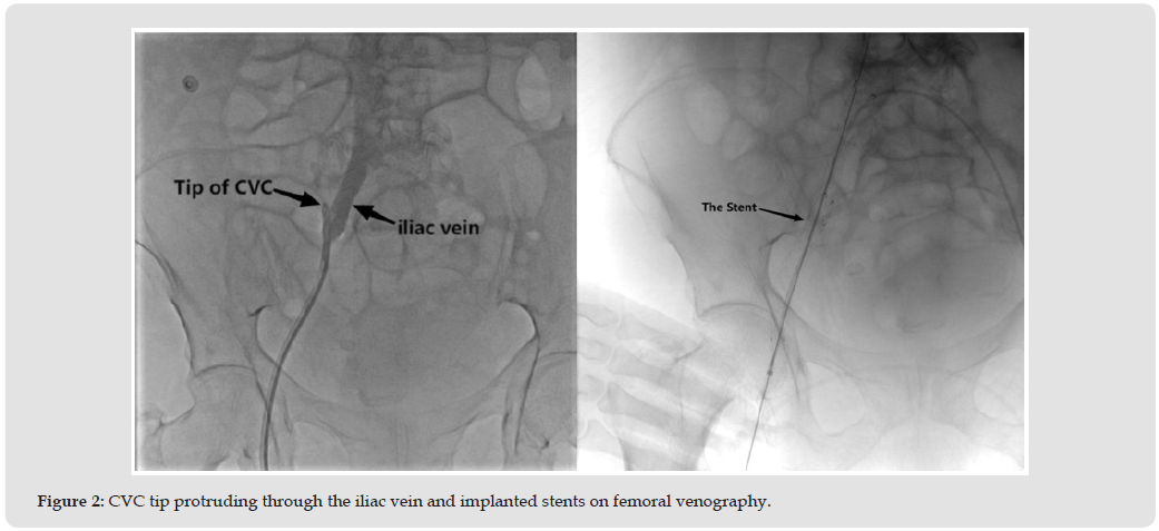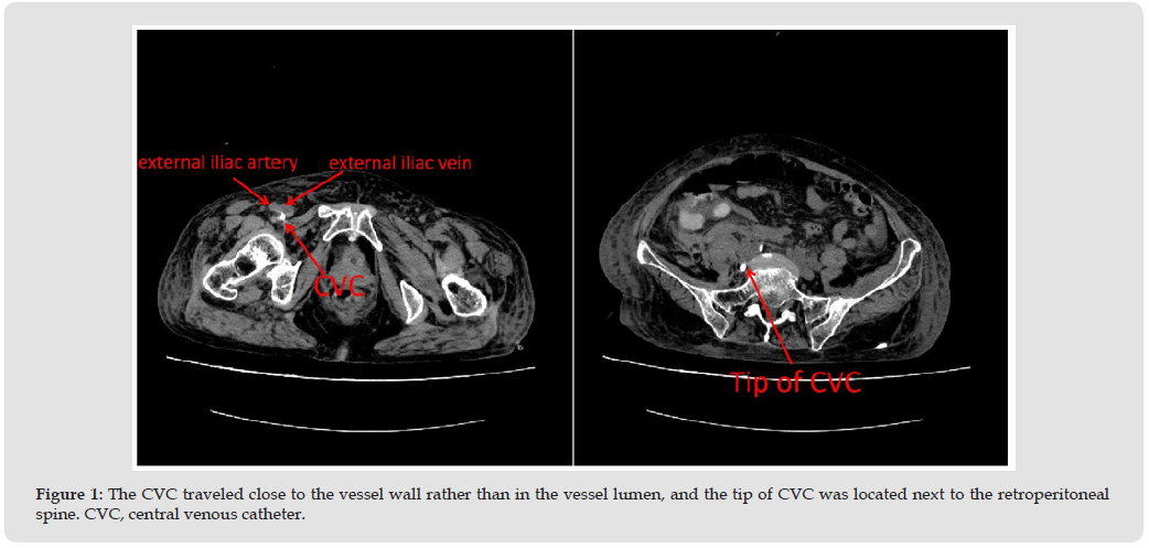 A 60-year-old woman with heart failure and chronic renal failure was admitted to our department and treated with percutaneous femoral vein catheterization for continuous renal replacement therapy (CRRT). But 2 days later, when the patient was physical examined due to persistent pain in the posterior lumbar region, large subcutaneous ecchymosis could be seen in the posterior lumbar region. Urgent blood test and abdominal CT scan were performed, suggesting she had decreased hemoglobin, a huge retroperitoneal hematoma, pelvic effusion, and a central venous catheter (CVC) tip outside the iliac vein (Figure 1). Considering the penetrating vein injury by CVC, the patient was treated with emergency femoral venography to clarify the diagnosis, and then was treated with femoral vein stent implantation (Figure 2). After the operation, the hemoglobin gradually increased and the hematoma gradually decreased.
