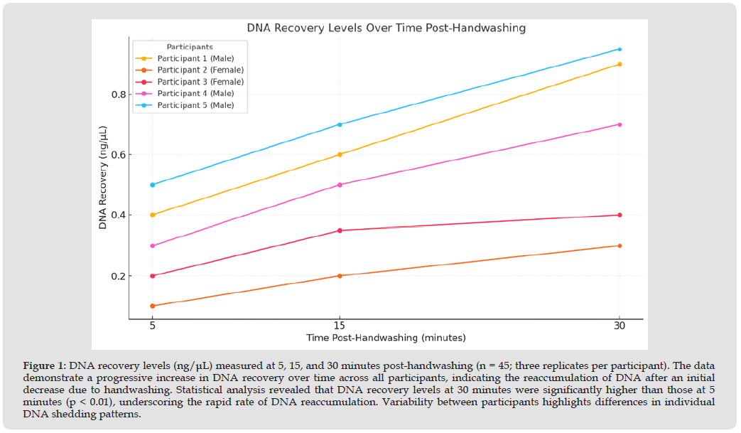 This study, while providing valuable insights into the dynamics of DNA shedding, has limitations that warrant consideration. The small sample size (n = 5) may not capture the full range of variability in DNA shedding across a broader population. The focus on handwashing with antibacterial soap further limits the generalizability of findings to other handwashing agents or conditions. The study also did not examine potential differences in DNA shedding between the dominant and non-dominant hands. Exploring whether variations in hand usage affect DNA recovery could provide valuable insights. Additionally, this research did not extend over long periods, precluding the assessment of sustained handwashing effects or behaviors such as touching the face or body, which might influence DNA reaccumulation. Finally, the study did not consider factors such as skin type, ethnicity, or age, which previous research has shown can significantly affect DNA shedding rates. Consequently, these findings may not fully represent all demographic groups.