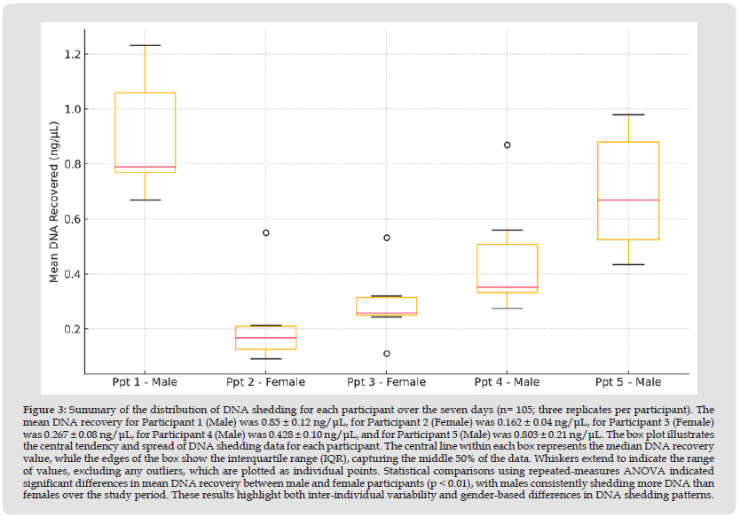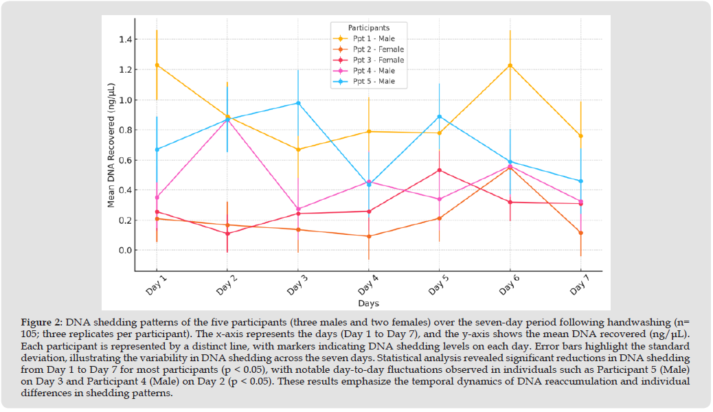 On average, male participants shed more DNA than female participants over the course of the seven days. The mean DNA recovery for male participants (e.g., Participant 1, 0.85 ± 0.12 ng/μL; Participant 5, 0.80 ± 0.21 ng/μL) was consistently higher than that of female participants (e.g., Participant 2, 0.16 ± 0.04 ng/μL; Participant 3, 0.27 ± 0.08 ng/μL). Statistical comparisons using repeated-measures ANOVA revealed a significant difference in DNA shedding rates between male and female participants (p < 0.01), supporting a potential gender- based influence on DNA shedding rates. Among the participants, certain individuals stood out as higher shedders. Participant 1 (Male) and Participant 5 (Male) consistently exhibited higher DNA recovery values compared to the others. Participant 1 maintained the highest DNA recovery values, even as overall shedding decreased over time. In contrast, Participants 2 and 3 (Females) exhibited lower overall DNA recovery, with Participant 3 showing more pronounced fluctuations. Within-participant variability was notable for some, such as Participant 5, who exhibited substantial fluctuations with a standard deviation of 0.218 ng/μL. Participant 4 (Male) also demonstrated variability, with notable increases in DNA shedding on Days 2 and 4, which were statistically significant compared to other days (p < 0.05). Conversely, female participants displayed more consistent, albeit lower, DNA shedding levels, with fluctuations that were not statistically significant (p > 0.05).