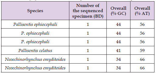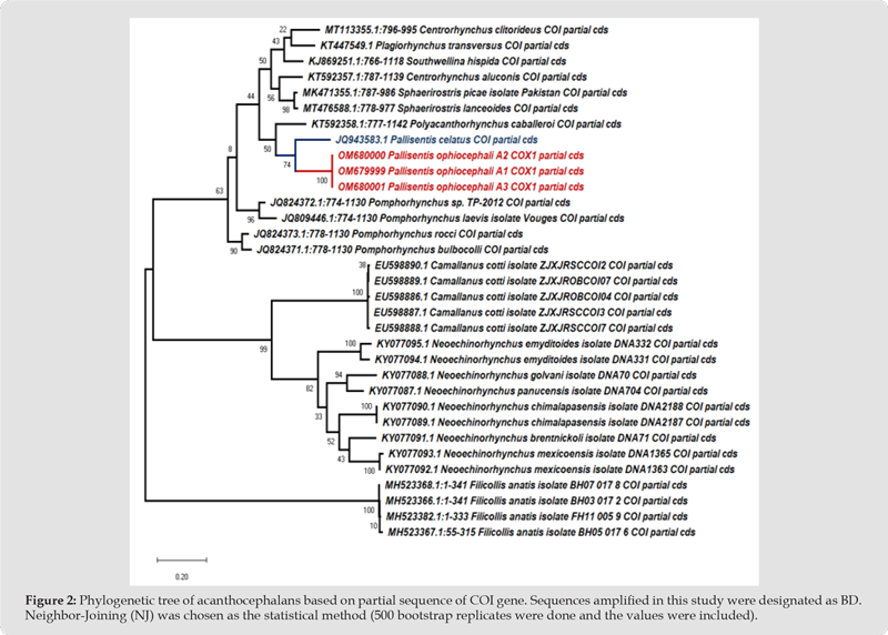 The technique has been extensively used to describe and differentiate species, particularly between closely related and sister species (Nadler, et al. [14,15]). Such methods contribute significantly to the current taxonomy of parasites through various genetic markers (Sharma, et al. [16,17]). The utility of COI in outlining, identifying and inferring phylogenetic relationships is well established across different organisms, including nematodes, digeneans, cestodes and acanthocephalans (Garcia-Varela, et al. [18]). Acanthocephalans, as spiny- headed worms, represent the phylum Acanthocephala, which comprises four classes: Archiacanthocephala, Eoacanthocephala, Palaeacanthocephala and Polyacanthocephala (Amin, et al. [19-21]).