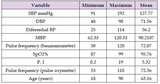 Observational, nonexperimental cross-sectional study. Convenience sample recruited from a private tertiary care hospital in western Mexico (from February 10 to March 10, 2024). Measurements of SBP and DBP were taken on the left arm while seated (after 5 minutes of rest and forearm support on a table) with informed consent for each patient. MAP was calculated for each patient. Additionally, portable pulse oximetry (with 100% battery) was performed on the third finger of the right hand (middle finger) in healthy adults (18 to 90 years), and PI was measured for 1 minute. All these measurements were carried out from 9 a.m. to 12 p.m. from Monday to Saturday. The ambient temperature was 23°C with 40% humidity. Shapiro-Wilk tests were performed to compare PI between both genders.