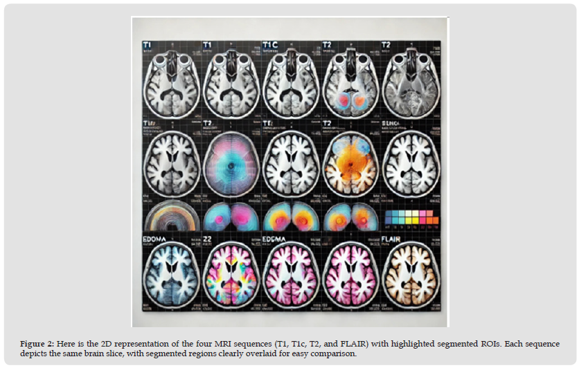 o The image integrates different MRI sequences, such as T1, T1c (contrast-enhanced), T2, and FLAIR.