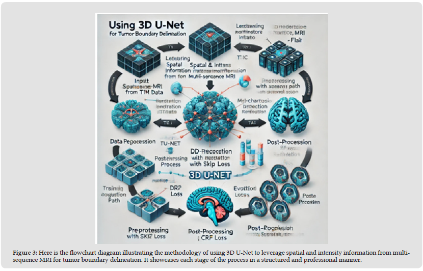 D U-Net, particularly when applied to multi-sequence MRI data, has demonstrated significant improvements in tumor boundary delineation, offering a powerful tool for medical image analysis. By leveraging complementary information from different MRI sequences, this approach provides a more comprehensive understanding of tumor morphology, leading to more accurate segmentation. Despite its challenges, ongoing advancements in model architecture and training techniques hold promise for overcoming the current limitations and enhancing the applicability of 3D U-Net in clinical settings. Creating a dataset for a 3D U-Net to leverage spatial and intensity information from different MRI sequences for tumor boundary delineation involves several key steps. This dataset needs to include high-quality MRI scans, multi-sequence imaging (e.g., T1, T1c, T2, FLAIR), and corresponding ground truth segmentations. In my system, it is trained and analyzed with the (Brain Tumor Segmentation (BraTS) Challenge Dataset). Provides multi-sequence MRI scans (T1, T1c, T2, FLAIR) with expert-labeled annotations for tumor sub-regions (necrosis, edema, enhancing tumor). It is suitable for training and validating 3D U-Net models.