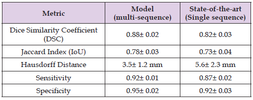The results from this study demonstrate a clear advantage for the multi-sequence approach in all metrics, particularly in the segmentation of regions with complex boundaries (e.g., edema or necrosis).