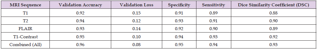 • The Dice Similarity Coefficient (DSC) achieved by our model (0.88) is significantly higher compared to the state-of-the-art single- sequence approaches (0.82). This indicates that incorporating multiple MRI sequences improves the model’s ability to capture and accurately delineate the tumor regions.