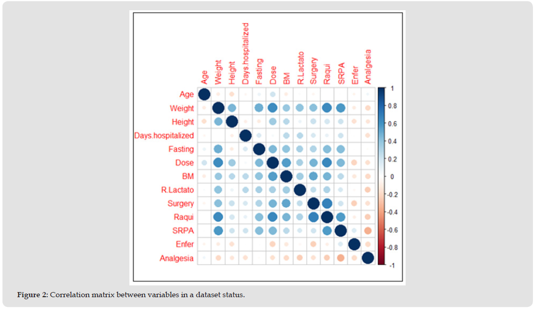 Seventy-four centenarians underwent surgery and anesthetized between 2010 and 2019 for femur fractures, 86.4% of whom were female (Figure 1). The age provided was confirmed with the supporting document. Demographic data of patients are shown in Table 2. The youngest being 100 years old and the oldest being 112 years old. All patients were anesthetized with regional anesthesia, with a combination of spinal anesthesia and lumbar plexus block. There were no problems related to anesthetic management. The major pre-existing illnesses in the 74 centenarians’ patients were result of arteriosclerotic, cardiac diseases and diabetes, 5.5% being ASA I, 81% ASA II and 13.5% ASA III. Of the 74 patients, only 1 (112 years) were referred to the ICU. All 74 centenarian patients entered the project directly and none were suspended from their surgical procedure. The average length of hospital stay before the procedure was 6 ± 4 days, with the earliest being 1 day and the longest being 24 days, due to material problems. The mean fasting time was 2:42 ± 0:45 hours, with the shortest time being 35 minutes and the longest fasting time of 4:00 hours. Correlation matrix between variables in a dataset status (Figure 2). The mean surgery time was 1:28 ± 0:30 hours and the mean duration of anesthesia was 2:33 ± 0:44 hours. Oral CHO administration in the PACU was on average 1:42 ± 0:48 hours and the stay in the PACU was on average 2:04 ± 0:42 hours. And the reintroduction of oral food in the ward was on average 6:08 ± 1:01 hours.
